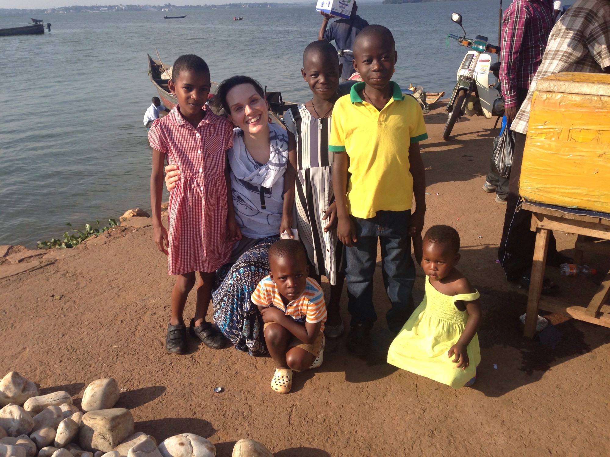 After sharing a hearty meal, we loaded up Tendo, Carol, and some cousins from down the street and headed to Ggaba village – a small bustling fishing waterfront district on the coast of Lake Victoria.   We walked hand in hand through the Saturday markets where one can purchase anything from saucepans, to wooden spoons, to firewood for cooking.  Heaping piles of tomatoes and “Irish”- white potatoes- stacked like cairns on a hiker’s trail marking the way!  A sensory overload- a feast for the eyes and the nose!
